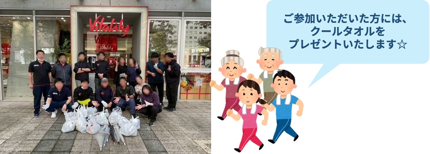 Vitalityプラザをスタート・ゴール地点とし、梅田茶屋町エリアを中心に『約4km』ゴミを拾いながら街を歩いていただくイベントです。心が健やかになりリフレッシュできること間違いなし!心と街の両方を美しく保つためにも、是非ご参加お待ちしております!Vitality会員様およびVitalityスマート加入者様(Vitality体験版は対象外)はVitalityポイント100pt(スポーツイベントのポイント)を獲得できます!Vitalityに加入されていない方でもお気軽に参加していただけます!